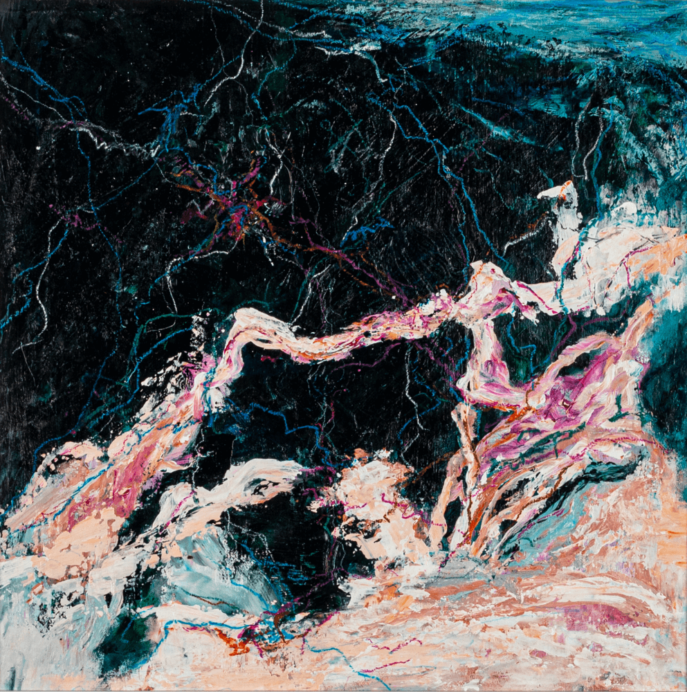 The artwork is experimental and full of movement. It blends acrylic paint, oil pastels, and mixed media to form a vibrant surface. As it is framed, it can easily become a powerful statement piece . It fits well in modern interiors and adds emotional depth to any space.